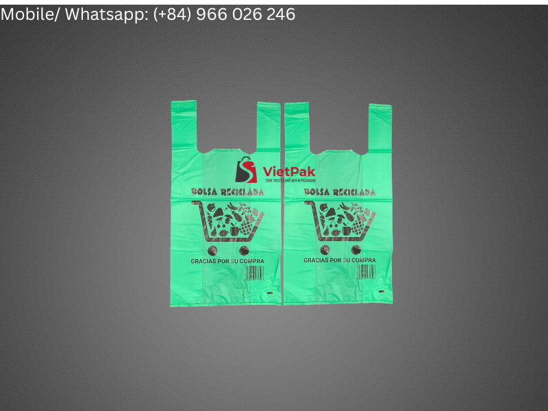 Vietpak supplies a wide range of green recycled T-shirt bags with popular dimensions for retail and grocery stores: